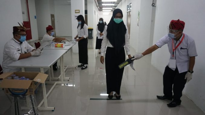 ”Peserta wajib melewati pemeriksaan suhu tubuh, mencuci tangan pakai sabun, menjaga jarak, dan diwajibkan memakai masker kesehatan atau masker kain serta memakai face shield jika ada,” imbuhnya.