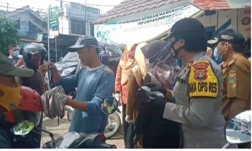 Selanjutnya, Kapolsek Pugung Ipda Okta Devi, SH. MH mendampingi Dandim 0424/Tanggamus Letkol Inf. Arman Aris Sallo membagikan masker di Pasar Babakan Kecamatan Pugung.
