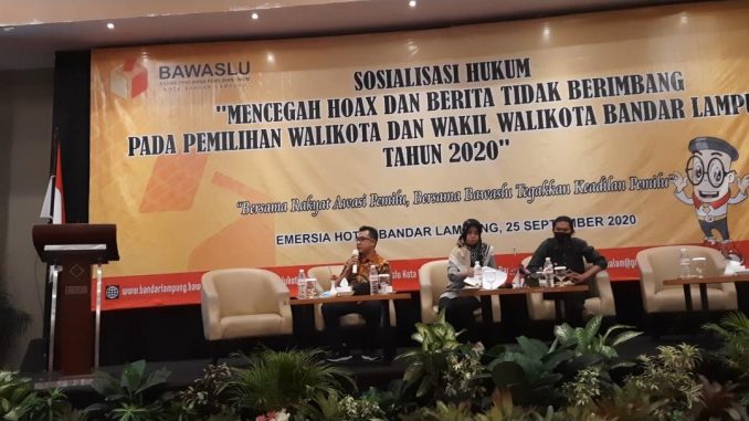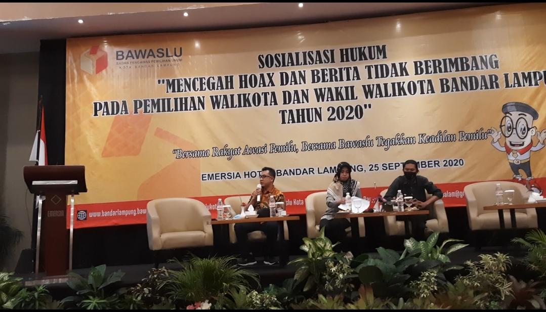 BANDARLAMPUNG,- Badan Pengawas Pemilu (Bawaslu) Kota Bandarlampung melaksanakan sosialisasi hukum mencegah hoaks dan berita tidak berimbang pada pemilihan walikota dan wakil walikota (Pilwakot) Bandarlampung tahun 2020 di Ballroom Hotel Emersia, Jumat (25/9).
