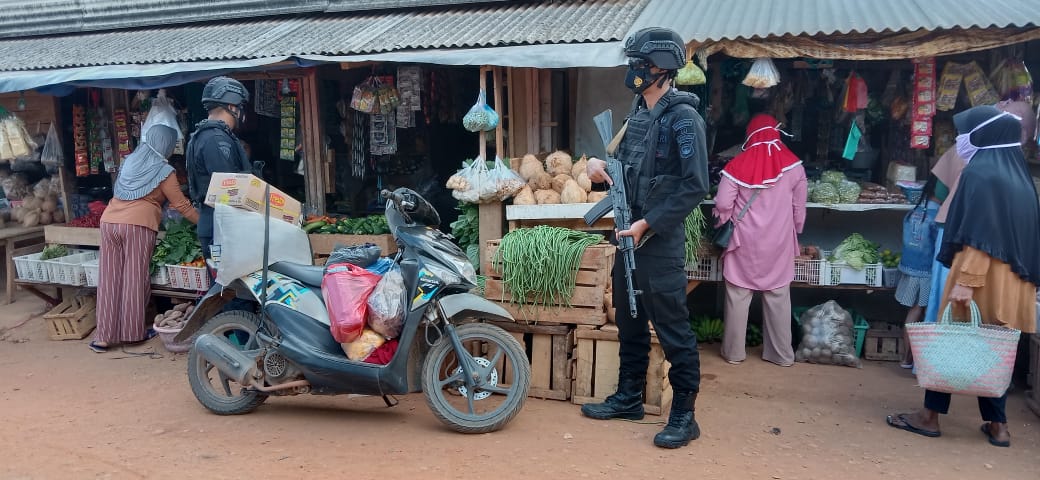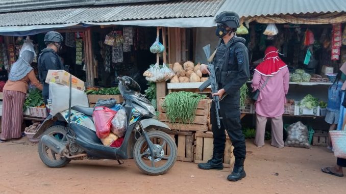 Brimob Lampung, wartasindo.com – Personel Kompi 2 Batalyon A Pelopor Satuan Brimob Polda Lampung yang tergabung dalam Ops Satgas Aman Nusa II 2020 terus melakukan kegiatan himbauan protokol kesehatan dan pembagian masker guna mencegah penyebaran Covid-19 yang mana kali ini dilakukan di Pasar Natar, Lampung Selatan. Sabtu (26/09/2020).
