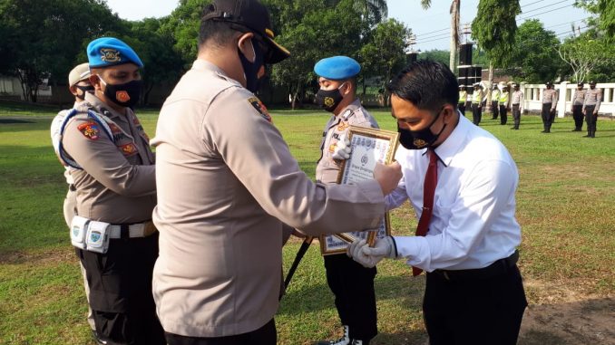 Way Kanan, wartasindo.com — Kapolres Way Kanan memberikan piagam penghargaan tujuh belas kepada Personel dari masing masing satfung dan Polsek Jajaran Polres Way Kanan yang berprestasi, di lapangan Apel Parama Satwika Polres Way Kanan. Senin (5/10/2020).