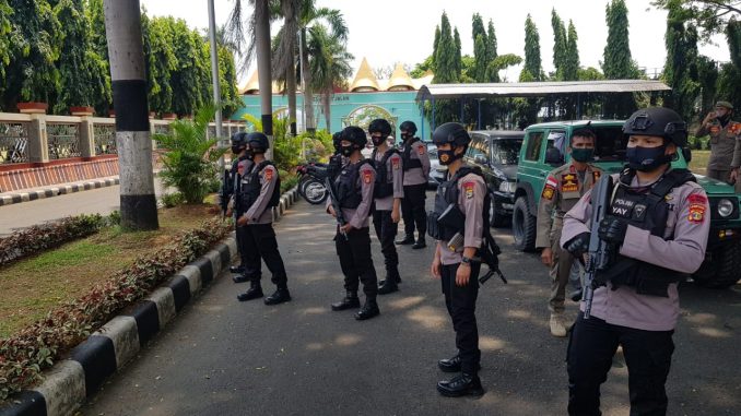 Brimob lampung – Antisipasi Aksi Unras dan Mogok Kerja berkaitan dengan Penolakan RUU Omnibuslaw Cipta Kerja di Tengah Pandemi Virus Covid 19, di wilayah Kec Sribawono Kab Lampung Timur satu team patroli siaga Kompi 2 Batalyon B Pelopor Sat Brimob Polda Lampung di pimpin Bripka I ketut artawan bergabung dengan angota Polres lampung tinmr serta Koramil Sribawono melaksanakan apel siaga di Mapolsek Bandar Sribawono Lampung Timur Rabu 7/10