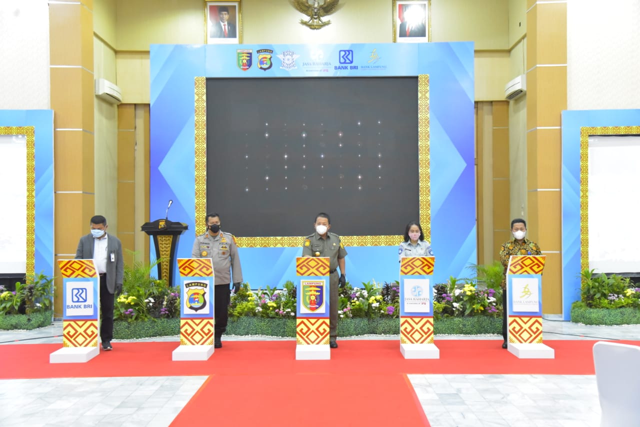 LAMPUNG- Launching samsat Pesawaran, Tulangbawang Barat (Tubaba) dan Pringsewu diresmikan Kapolda Lampung Irjen Pol Purwadi Arianto via virtual dihadiri Gubernur Arinal Djunaidi, Danrem 043/Gatam Brigjen TNI Toto Jumariono, Danbrigif 4 Mar/BS Kolonel Mar Nawawi, Danlanud M. Bunyamin Letkol Pnb. Ronald, Ketua DPR Provinsi Lampung Mingrum Gumay, Kepala jasaraharja cabang Lampung Margareth V.S Panjaitan dan Danlanal Lampung diwakili kapten Pomal Saipudin.