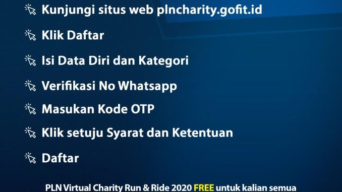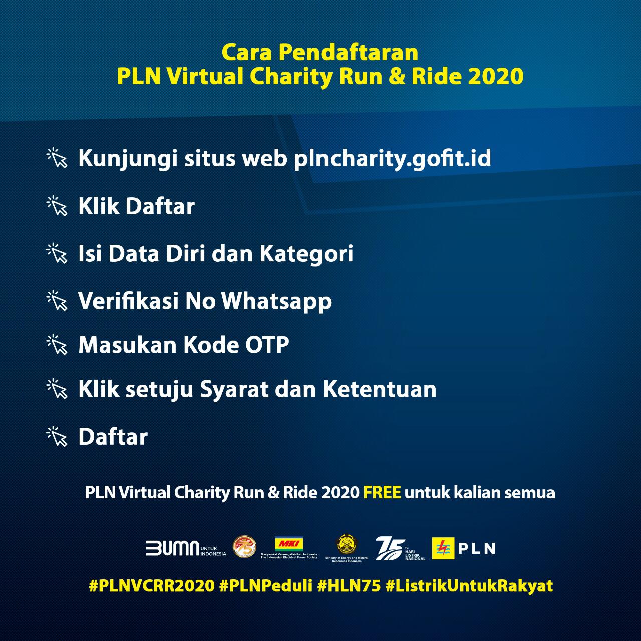 Masyarakat yang ingin ikut serta dalam kegiatan ini dapat melakukan pendaftaran melalui http://plncharity.gofit.id/ mulai tanggal 15 Oktober 2020 dan tidak dipungut biaya apapun (GRATIS). Peserta akan diberikan pilihan kategori jarak, baik lari ataupun sepeda yang akan diselesaikannya selama periode tertentu yaitu tanggal 16 Oktober 2020 sampai tanggal 28 Oktober 2020. Jarak lari ataupun sepeda tersebut dapat diselesaikan lebih dari satu kali aktivitas.