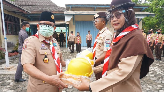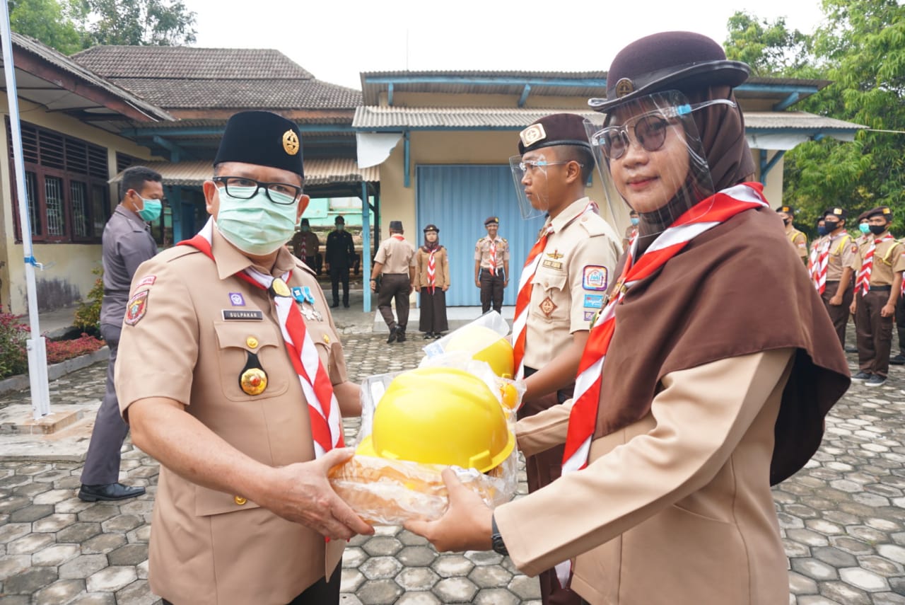 Pjs Bupati Lampung Selatan, juga sempat memberikan Alat Pelindung Diri (APD) berupa helm, face shield, dan sepatu boot secara simbolis kepada dua orang anggota Gerakan Pramuka Lampung Selatan.