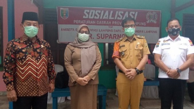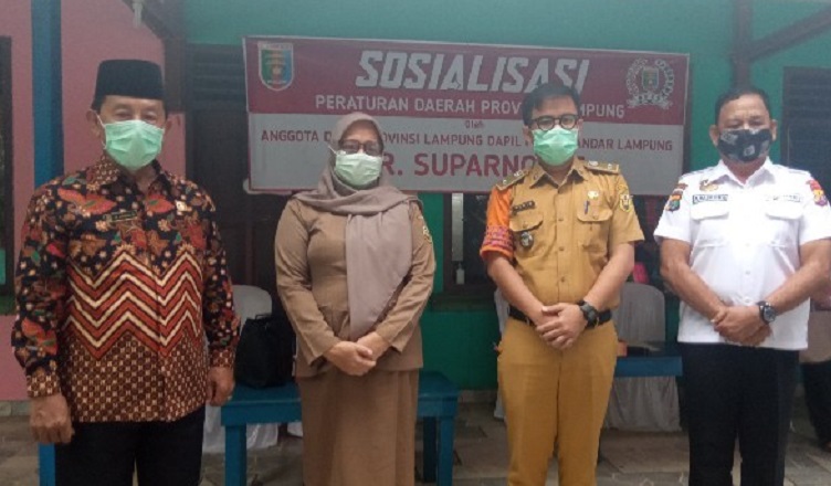 Anggota DPRD Provinsi Lampung, Suparno menggelar Sosialisasi Peraturan Daerah Provinsi Lampung Nomor 3 Tahun 2020 tentang Adaptasi Kebiasaan Baru dalam Pencegahan dan Pengendalian Corona Virus Disease 2019 di Kantor Kelurahan Sukamenanti, Kecamatan Kedaton, Selasa (26/1/2021).