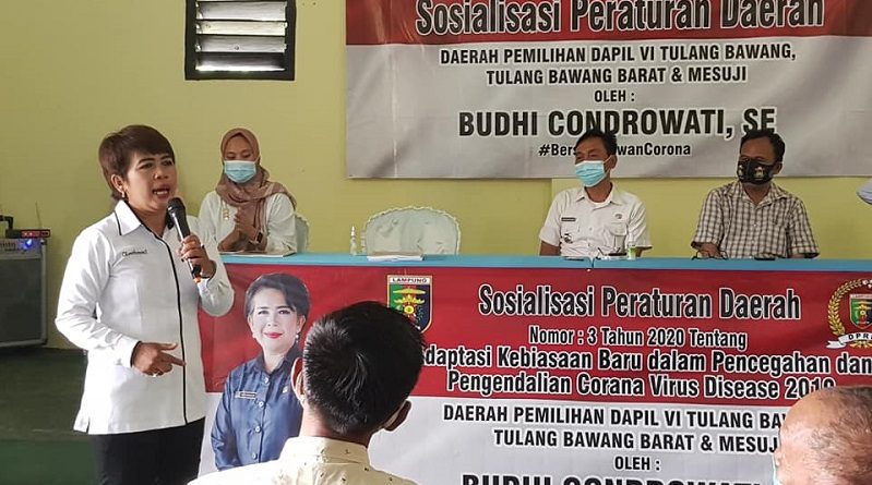 Anggota DPRD Provinsi Lampung, Budhi Condrowati menggelar Sosialisasi Perda (Sosper) Nomor 3 Tahun 2020, tentang Adaptasi Kebiasaan Baru dalam Pencegahan dan Pengendalian Corona Virus Disease 2019 di Tiyuh Margo Mulyo, Tumijajar, Tulangbawang Barat (Tubaba). Rabu (28/1/2021)