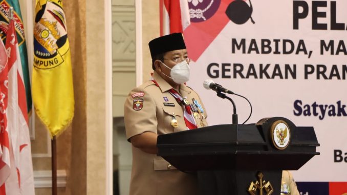 BANDARLAMPUNG, wartasindo.com — Gubernur Lampung Arinal Djunaidi dilantik sebagai Ketua Majelis Pembimbing Daerah (Ka Mabida) Gerakan Pramuka Lampung Masa Bakti 2020-2025 oleh Sekretaris Jenderal Kwartir Nasional Gerakan Pramuka Mayjen TNI (Purn) Bachtiar, di Balai Keratun Kantor Gubernur Lampung, Rabu (10/02).