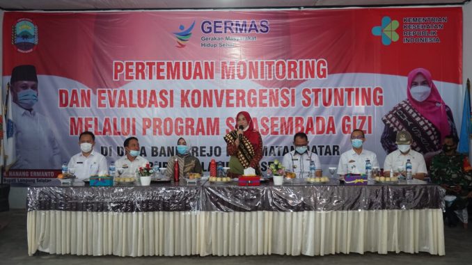 NATAR, – Ketua Tim Penggerak PKK Kabupaten Lampung Selatan sekaligus Duta Swasembada Gizi Lampung Selatan, Hj. Winarni Nanang Ermanto melakukan monitoring dan evaluasi (monev) pelaksanaan konvergensi intervensi stunting melalui program Swasembada Gizi di Balai Desa Bandar Rejo, Kecamatan Natar, Rabu (10/2/2021).
