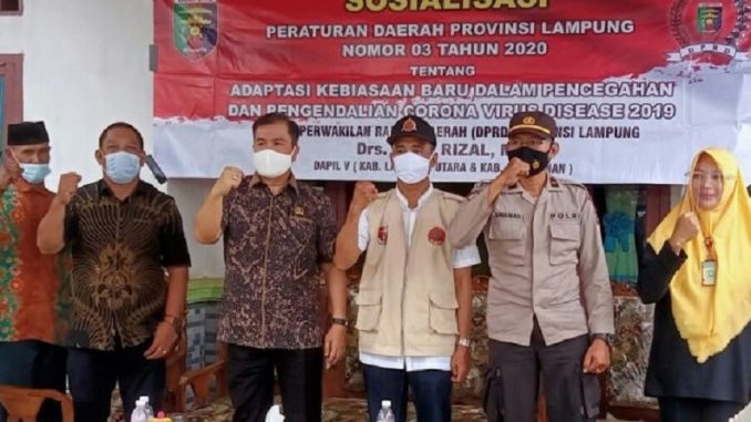 Anggota DPRD Lampung Komisi III Yose Rizal sosialisasikan Peraturan Daerah (Perda) Nomor 3 Tahun 2020 tentang Adaptasi Kebiasaan Baru Pencegahan dan Pengendalian Covid-19 di Kelurahan Tanjung Senang, Kecamatan Kotabumi Selatan, Lampung Utara, minggu 14 Februari 2021.