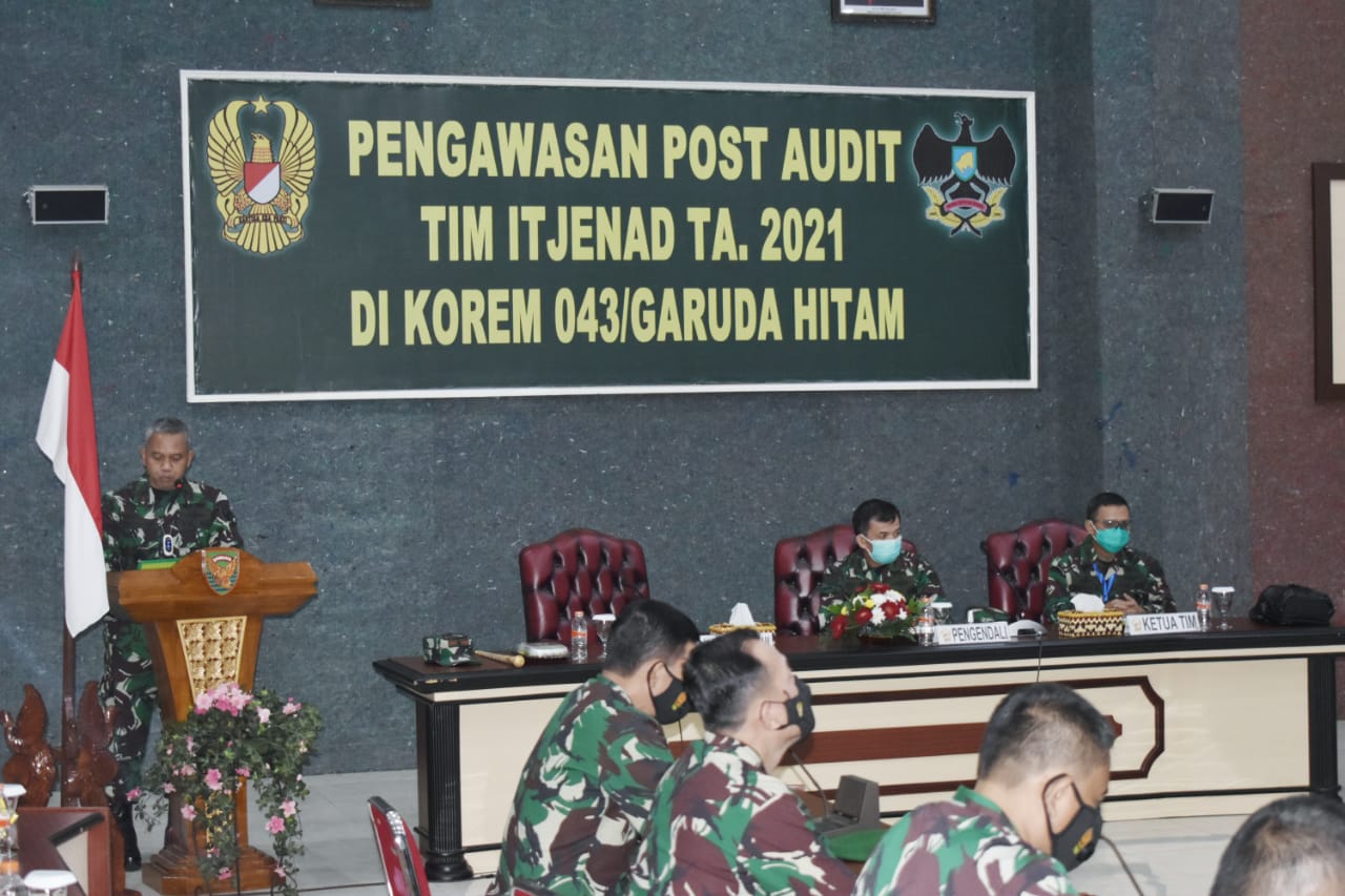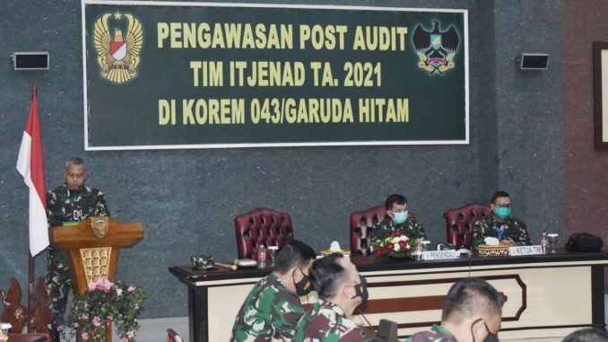 Danrem 043/Gatam Sambut Tim Itjenad Dalam Rangka Pengawasan Post Audit TA. 2021