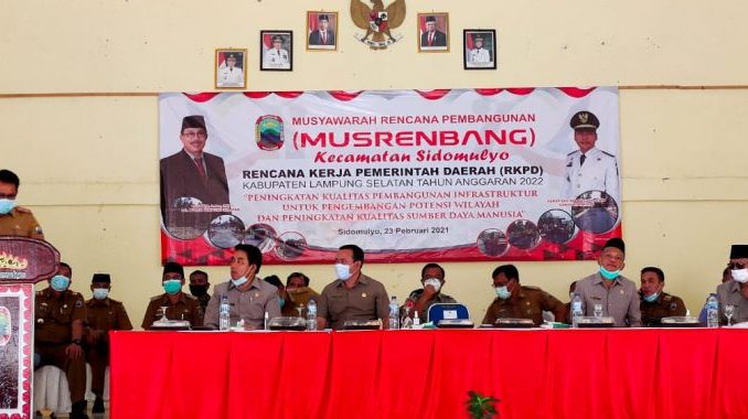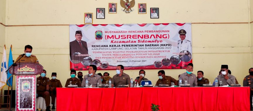 SIDOMULYO, – Plh. Bupati Lampung Selatan Thamrin membuka Musyawarah Rencana Pembangunan ( Musrembang) Rencana Kerja Pemerintah Daerah ( RKPD) di kecamatan Sidomulyo, Selasa 23/02/2021.