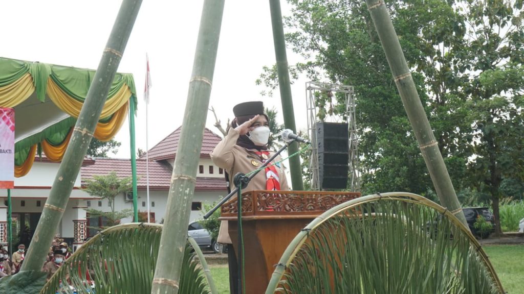WAY SULAN – Anggota Majelis Pembimbing Gerakan Pramuka Kabupaten Lampung Selatan Hj. Winarni Nanang Ermanto Pimpinan Upacara Pengukuhan Pengurus Kamabiran, Kwaran, LPK, Mabisaka Bakti Husada, Mabisaka Widya Budaya Bakti Kwartir Ranting Way Sulan Masa Bakti 2021-2024, Selasa (6/4/2021).