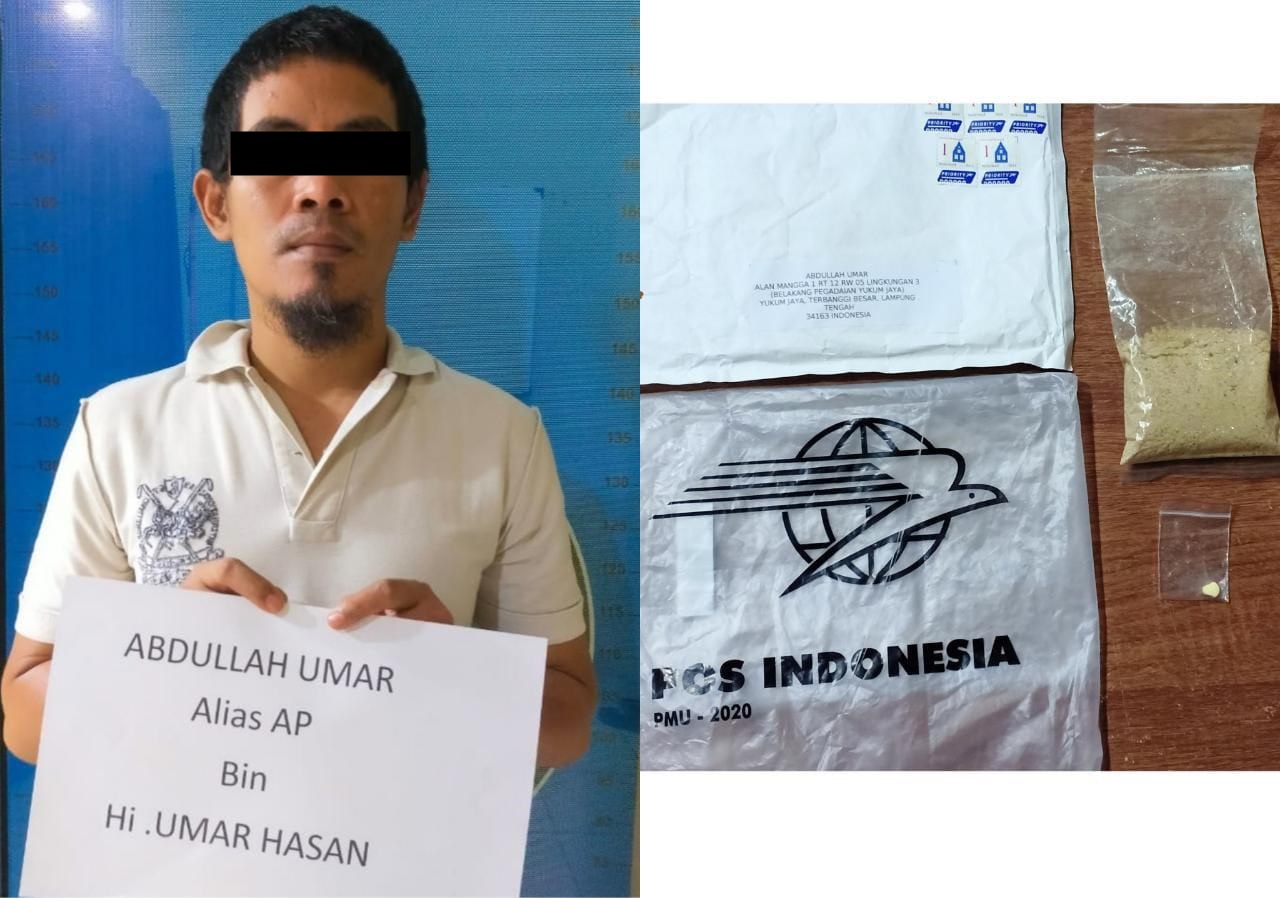 Kemudian Paket 1 (Satu) buah plastik bening bertuliskan Pos Indonesia berlogo burung merpati dan 1 (Satu) buah amplop besar warna putih bertuliskan Abdullah Umar Jalan Mangga 1 Rt/Rw 12/05 Lingkungan 3 (Belakang Pegadaian Yukum Jaya) Kec.Terbanggi Besar Kab.Lampung Tengah dan dibuka berisikan 1 (Satu) bungkus plastik bening ukuran besar berisi serbuk warna coklat diduga narkotika jenis extacy berat beserta bungkus 104.67 Gram, kata Yofi.