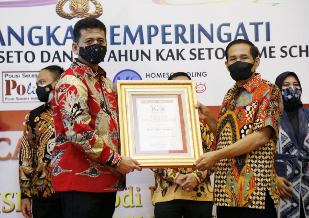 Kapolres Asahan menerima Penghargaan Langsung dari Kak Seto atas Penghargaan Edisi Special 51 Tahun Kak Seto dan Menerima Penganugerahan dari Pencatat Prestasi Polisi Selebriti yang diserahkan langsung Oleh Kapolri diwakili Kabag Anev Biro PID Divhumas Polri, Kombes Pol Drs. Sugeng Hadi Sutrisno.