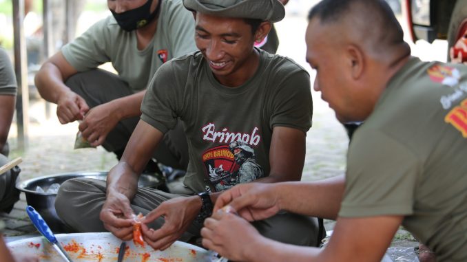 Bandar Lampung, – Peduli dengan masyarakat terdampak Covid-19, Personel Satuan Brimob Polda Lampung, buka dapur umum, di Lapangan Baruna, Panjang, Telukbetung Selatan, Bandar Lampung, pada Kamis (22/04/2021).