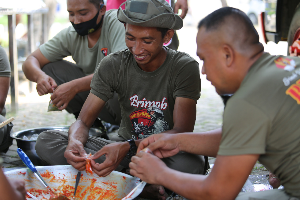 Menurutnya, di dapur umum, para personel Satuan Brimob Polda Lampung, memasak makanan untuk dibagi-bagikan ke masyarakat sekitar.