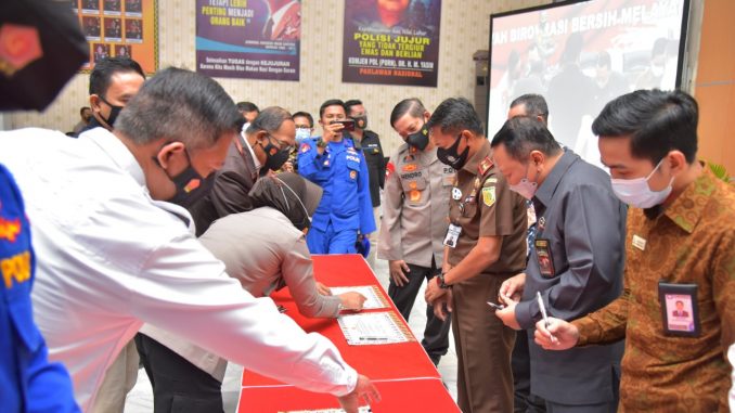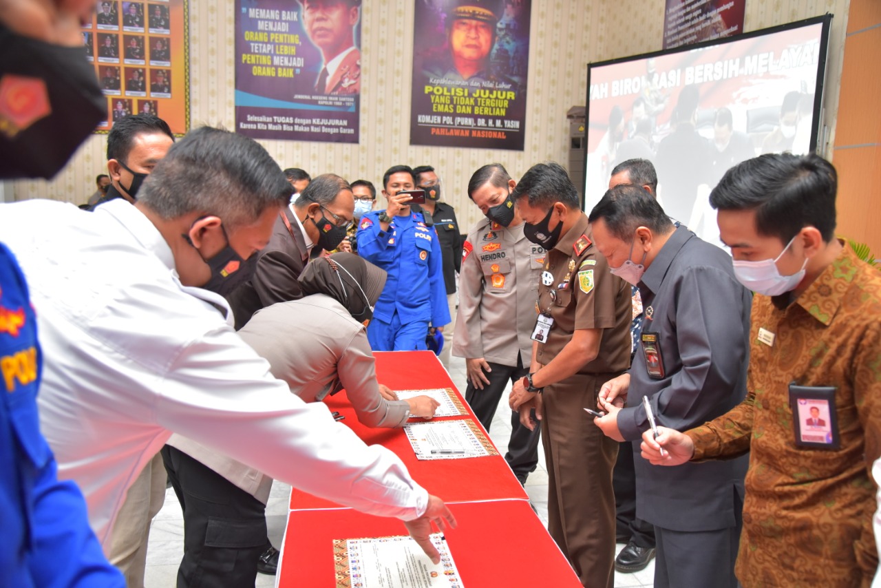 Bandarlampung – Bandarlampung – Kapolda Lampung Irjen Pol Hendro Sugiatno, didampingi Wakapolda Lampung Brigjen Pol Subiyanto dan Pejabat Utama Polda Lampung melaksanakan Pencanangan Pembangunan ZI (Zona Integritas) menuju WBK (Wilayah Bebas Korupsi)/ WBBM (Wilayah Birokrasi Bersih Melayani di Satker Polda Lampung tahun 2021.(22/04)