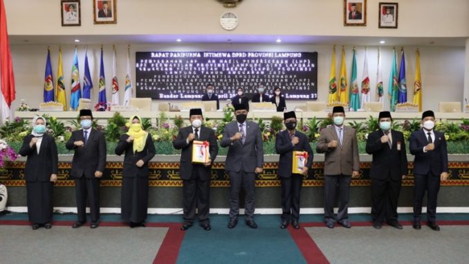 Rapat Paripurna Istimewa DPRD Lampung dalam rangka penyerahan Laporan Hasil Pemeriksaan (LHP) BPK Perwakilan Lampung atas Laporan Keuangan Pemerintahan Daerah (LKPD) Provinsi Lampung Tahun Anggaran 2020 di Ruang Sidang DPRD Provinsi Lampung dipimpin Ketua DPRD Mingrum Gumay.