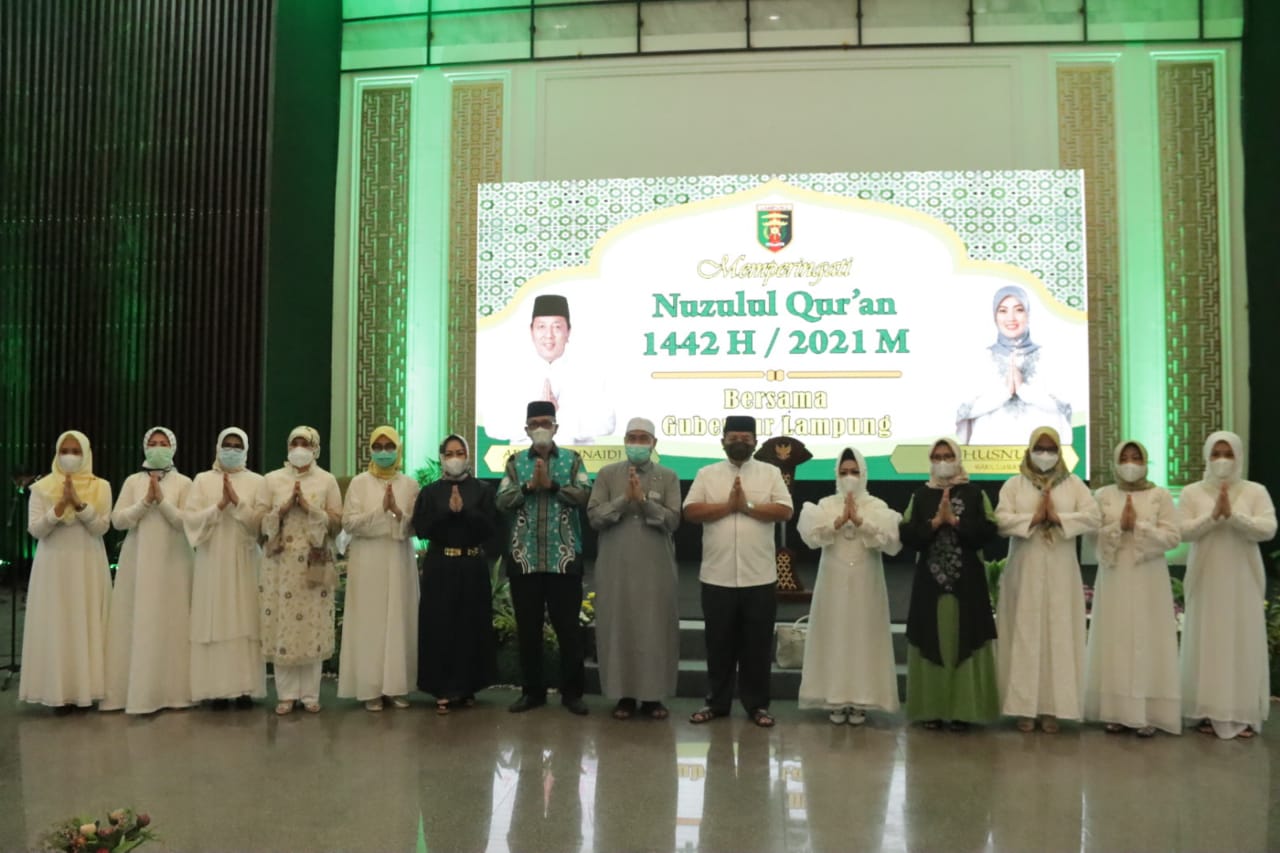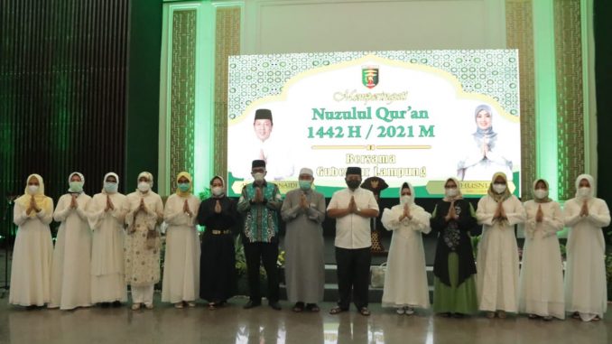 Bandar Lampung — Gubernur Arinal Djunaidi menyelenggarakan Peringatan Nuzulul Quran 1442 H / 2021 M, bertempat di Mahan Agung, Jumat (30/04). Peringatan Nuzulul Quran 1442 H / 2021 M ini juga dihadiri oleh Ketua TP PKK Provinsi Lampung, Sekda Provinsi Lampung, Bupati/Walikota se-Provinsi Lampung secara daring, Kepala OPD di Lingkungan Pemprov Lampung, Ketua MUI Provinsi Lampung.