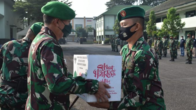 Bandar Lampung, – Komandan Korem 043/Gatam Brigjen TNI Drajad Brima Yoga S.I.P.,M.H memberikan bingkisan lebaran yang dilakukan secara simbolis kepada Prajurit dan PNS Usai melaksanakan apel pagi bertepatan dilapakan Makorem 043/Gatam. (06/05/2021).