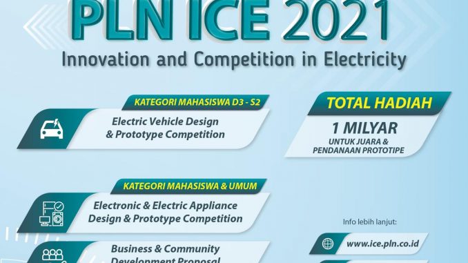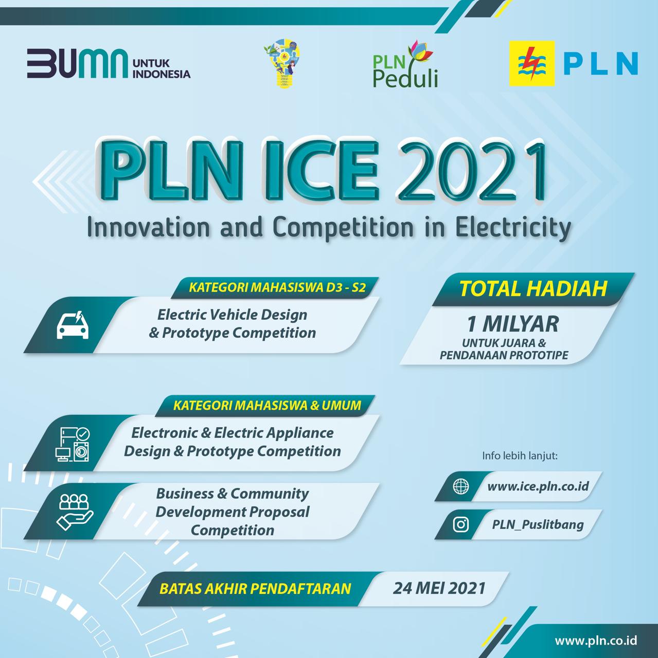 Bertajuk PLN ICE 2021 (Innovation & Competition in Electricity), terdapat 2 (dua) kategori yang di kompetisikan, yaitu Kendaraan Listrik dan Non Kendaraan Listrik. Untuk kategori kendaraan listrik terdapat 4 (empat) sub kategori yaitu sub kategori mobil listrik, sub kategori motor listrik, sub kategori sepeda listrik dan sub kategori kendaraan listrik roda tiga. Sementara untuk kategori Non Kendaraan Listrik terdapat 2 (dua) sub kategori yaitu sub kategori peralatan listrik dan sub kategori program bisnis.