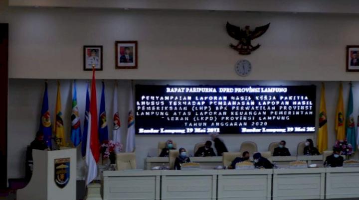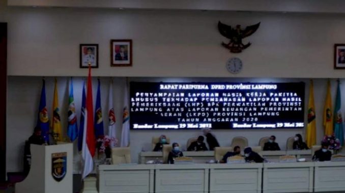 (SMSI), Bandar Lampung – Rapat Paripurna DPRD Provinsi Lampung atas laporan Panitia husus (Pansus) Laporan Hasil Pemeriksaan (LHP) Badan Pemeriksa keuangan (BPK) Republik Indonesia (RI) memberikan 12 atensi atau permasalahan terhadap Laporan Keuangan di Pemerintah Provinsi (Pemprov) Lampung Tahun Anggaran 2020, Rabu,19 Mei 2021