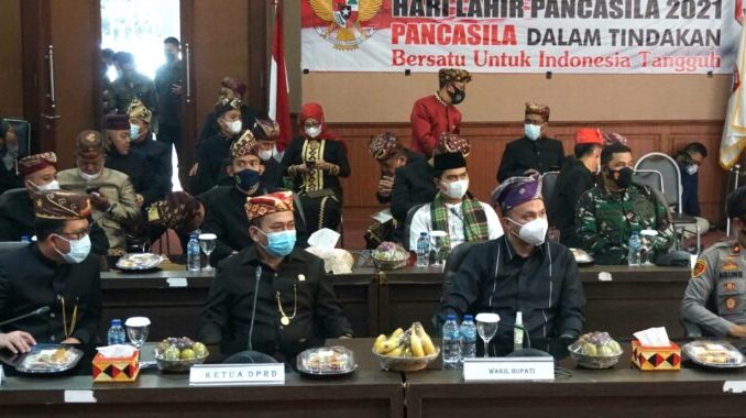 KALIANDA, – Wakil Bupati Lampung Selatan, Pandu Kesuma Dewangsa, S.IIP mengikuti upacara peringatan Hari Lahir Pancasila melalui zoom meeting dengan Presiden Joko Widodo dari Aula Krakatau, kantor bupati setempat, Selasa (1/6/2021).