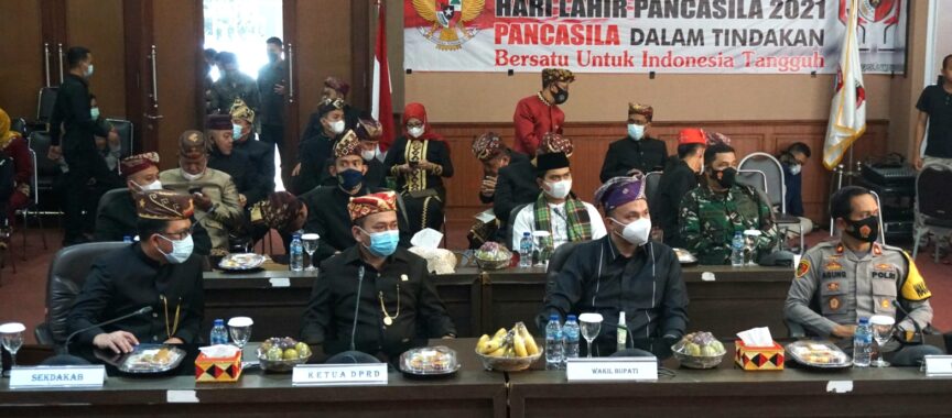 Meski dilaksanakan secara virtual, Wakil Bupati bersama Forkopimda, Sekretaris Daerah dan kepala OPD yang mengenakan pakaian adat Lampung, nampak khidmat mengikuti jalannya upacara peringatan Hari Lahir Pancasila.