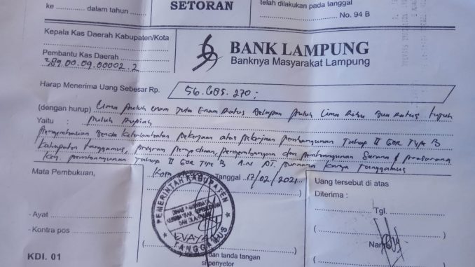 “Denda itu sudah disetorkan ke BANK Lampung kepada KAS Pemda dengan jumlah nilai Rp.3.244.730,- pada tanggal 29 Januari 2021. Penyetoran kedua bernilai Rp.56.685.270,- pada tanggal 12 Februari 2021. Maka, tim BPK menyatakan bahwa sudah selesai secara administrasi terkait temuan denda untuk pekerjaan pembangunan GOR tipe II, sehingga tidak ada temuan lagi dan sudah ditindaklanjuti,”tukasnya.