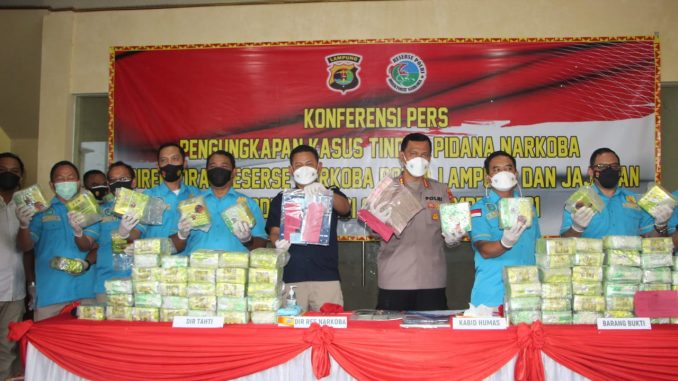 Bandar Lampung – Kepolisian Daerah (Polda) Lampung mengungkap kasus perkara narkotika dengan barang bukti ratusan kilogram narkotika selama periode Januari-September 2021, di antaranya narkotika jenis ganja, sabu, ekstasi, psikotropika dan tembakau gorilla, Rabu (22/9/2021) sore.