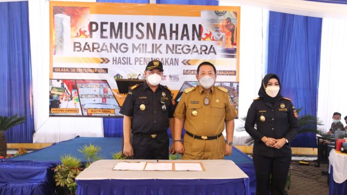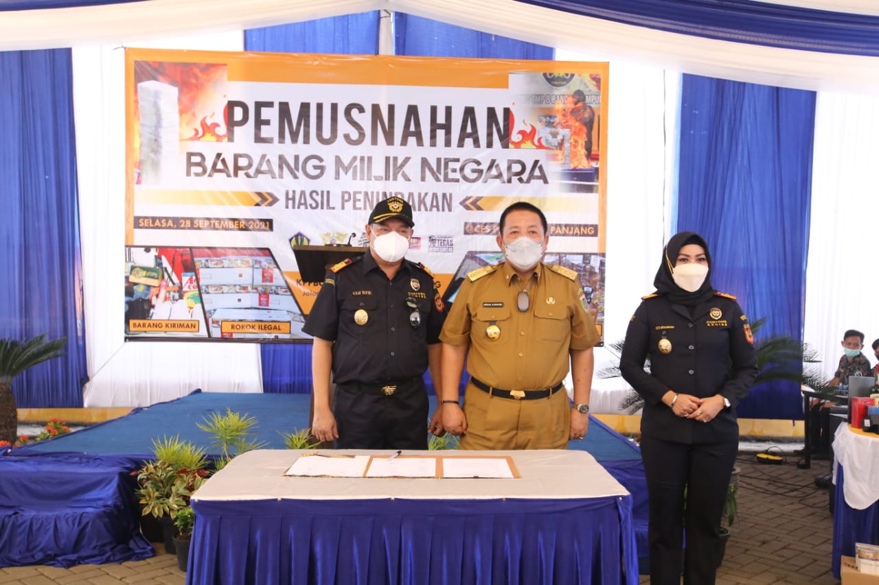 BANDARLAMPUNG —–Gubernur Lampung Arinal Djunaidi menghadiri acara Pemusnahan Barang Milik Negara Hasil Penindakan Kantor Pengawasan dan Pelayanan Bea dan Cukai (KPPBC) TMP B Bandar Lampung, di Container Freight Station (CFS) Pelabuhan Panjang, Bandar Lampung, Selasa (28/9/2021).