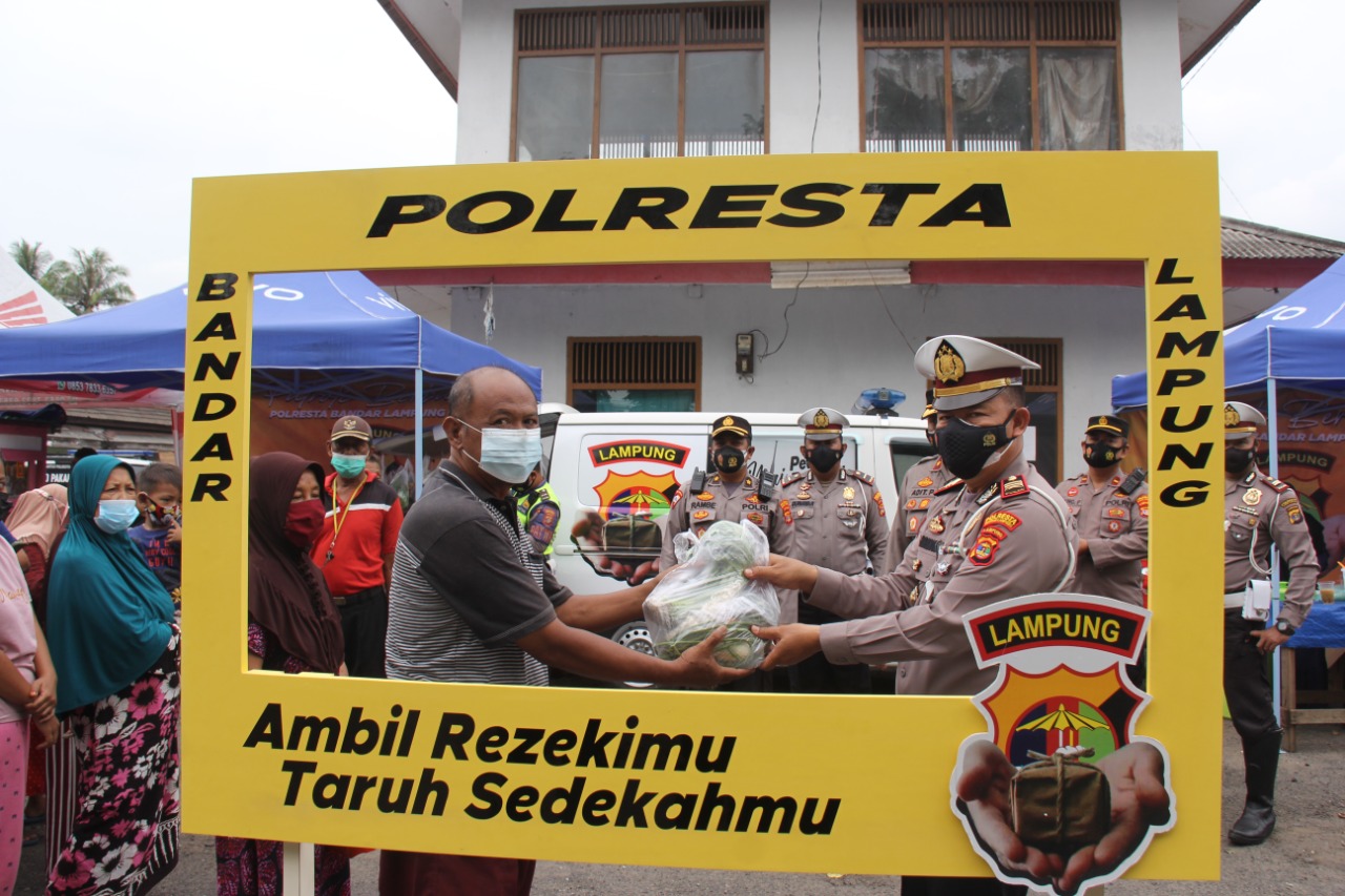 Secara Simbolis Kapolresta Bandar Lampung Kombes Pol Ino Hariantio, S.I.K. yang diwakili Kabag Ops Kompol A.R.Hakim Rambe, S.Kom., M.T.I. dengan didampingi Kasat Lantas AKP M.Rohmawan, SH., M.H. dan Kapolsek Panjang Kompol Adit Priyanto, S.H,S.ik,M.M, membagikan Paket Sayuran Kepada Masyarakat.