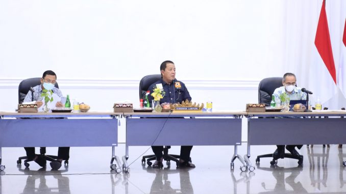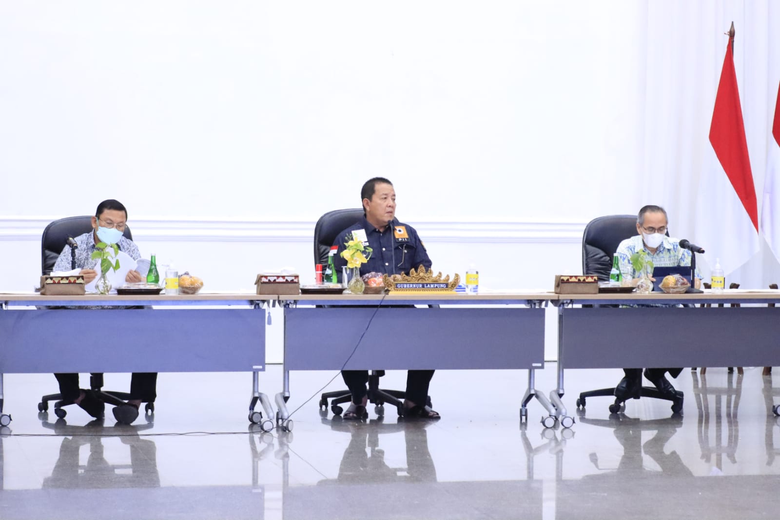 Bandar Lampung — Gubernur Arinal Djunaidi memimpin Rapat Pembahasan terkait Program Kartu Petani Berjaya (KPB) didampingi oleh Ketua KTNA Provinsi Lampung Hanan Rozak dan Staf Ahli IT Gubernur Lampung Syopiansyah Jaya Putra, di Mahan Agung, Senin (7/2).