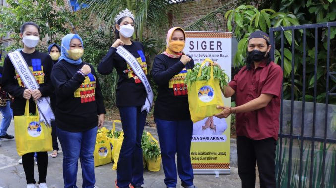 Bandar Lampung, — Ketua TP. PKK Provinsi Lampung, Riana Sari Arinal didampingi Finalis Puteri Indonesia asal Provinsi Lampung Feby Annisa dan Puteri Indonesia favorit Irene Garcia menyalurkan bantuan kepada masyarakat dalam gerakan SiGeR, bertempat di Jl. Nuri kelurahan Pengajaran Bandar Lampung, Rabu (09/02/2022).