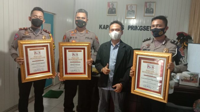Pringsewu, – Kapolres Pringsewu, AKBP Rio Cahyowidi, SIK., MIK., bersama Kasatlantas Polres Pringsewu, Iptu Ridho Grisyan Adidharya, S.Tr.K., MH., dan PS Kanit Gakum Satlantas Polres Pringsewu mendapatkan penghargaan pada Edisi 3 Tahun Polisi Selebriti Berkarya Bersama Polri.Rabu, 23 Februari 2022, Pukul 15.00 WIB, di Mapolres Pringsewu, Polda Lampung.