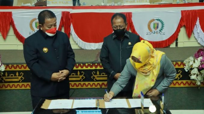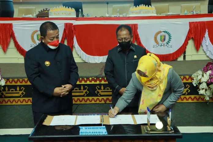 Selanjutnya Gubernur Lampung Arinal Djunaidi bersama Ketua DPRD Provinsi Lampung Mingrum Gumay serta Wakil Ketua II DPRD Ririn Kuswantari menandatangani nota kesepakatan perubahan kebijakan umum anggaran dan prioritas plafon anggaran sementara APBD Provinsi Lampung Tahun Anggaran 2022.