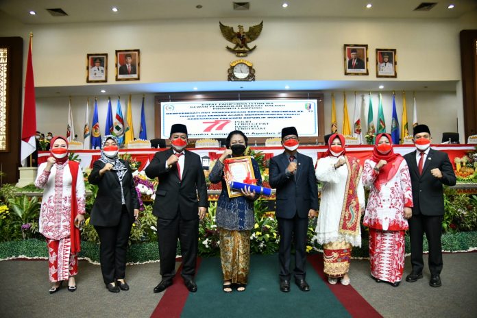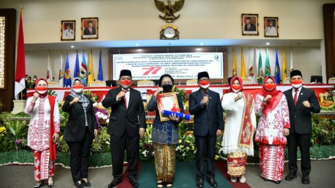 Gubernur Lampung Arinal Djunaidi, mengikuti Rapat Paripurna DPRD Mendengarkan Pidato Kenegaraan Presiden RI Dalam Rangka Peringatan HUT Ke-77 Kemerdekaan RI Tahun 2022 secara Hybrid di Ruang Sidang DPRD Provinsi Lampung, Selasa (16/08/2022).