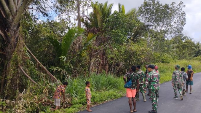 Keerom – Serdadu wira Pos Kalipao ajak warga masyarakat gotong royong membersihkan lingkungan di Kampung Yuwainda, Distrik Waris, Kab. Keerom, Papua, Rabu ( 30/11/2022 ).