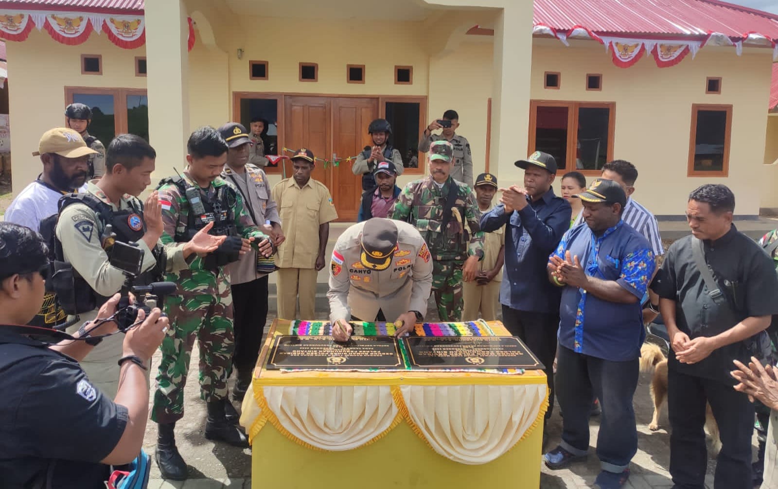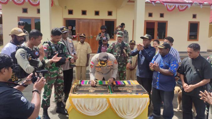 Pegunungan Bintang – Satgas Yonif 143/TWEJ Pos Okbibab yang dipimpin Letda Inf Briant Purba Wisesa, S.Tr (Han) bersama dengan Jajaran terkait baik Polri maupun Aparat Pemda setempat mendatangi Polsek Okbibab dalam rangka peresmian Kantor Mapolsek Okbibab di Kampung Abmisibil, Distrik Okbibab, Kab. Pegunungan Bintang, Papua, Minggu (4/12/2022).