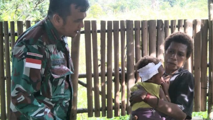 Keerom – Satgas Yonif 143/TWEJ Pos Tatakra dengan cepat ambil tindakan Medis kepada mama Modesta warga Kampung Tatakra karena anaknya yang masih Balita Ana Putri ( 3 tahun ) alami infeksi bernanah pada bagian kepala di Pos Tatakra, Kampung Tatakra, Distrik Web, Kabupaten Keerom, Papua, Kamis (08/12/2022).