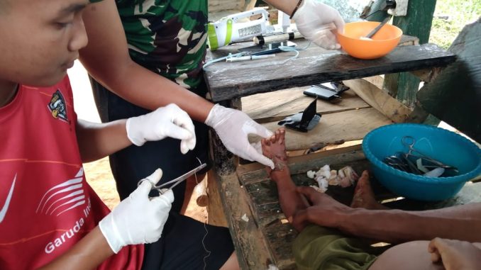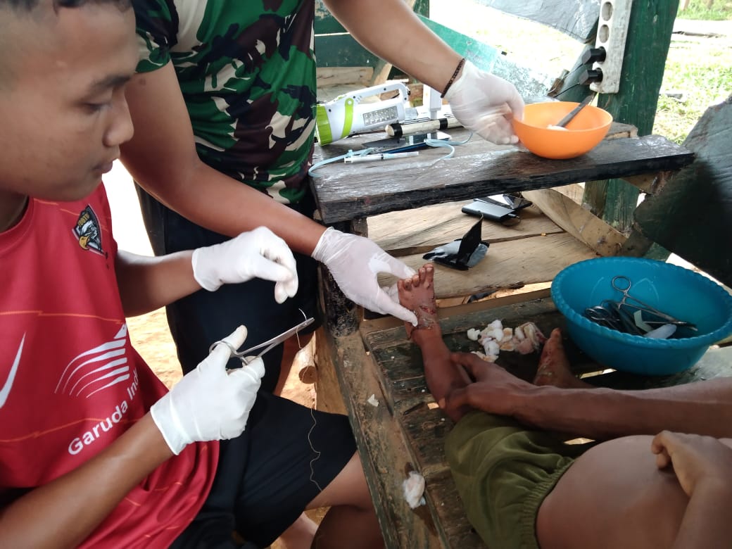 Dengan cepat dan tepat anggota kesehatan Somografi tanpa ragu melakukan tindakan kemanusiaan dengan memberikan tindakan medis berupa 7 Jahitan di bagian kaki adik Dolvina Mondo.