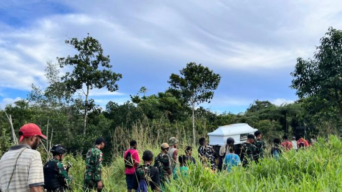 Keerom – Seolah tidak pernah lelah untuk melakukan yang terbaik, Satgas Yonif 143/TWEJ selalu hadir di tengah-tengah masyarakat salah satunya menghadiri Prosesi pemakaman almh Ny Clara Tamb (84 tahun) Ibunda Bapak Marinus Pallop (54 tahun) yang telah meninggal dunia karena sakit di Kampung Somografi , Distrik Web, Kab. Keerom, Papua, Kamis (15/12/2022).