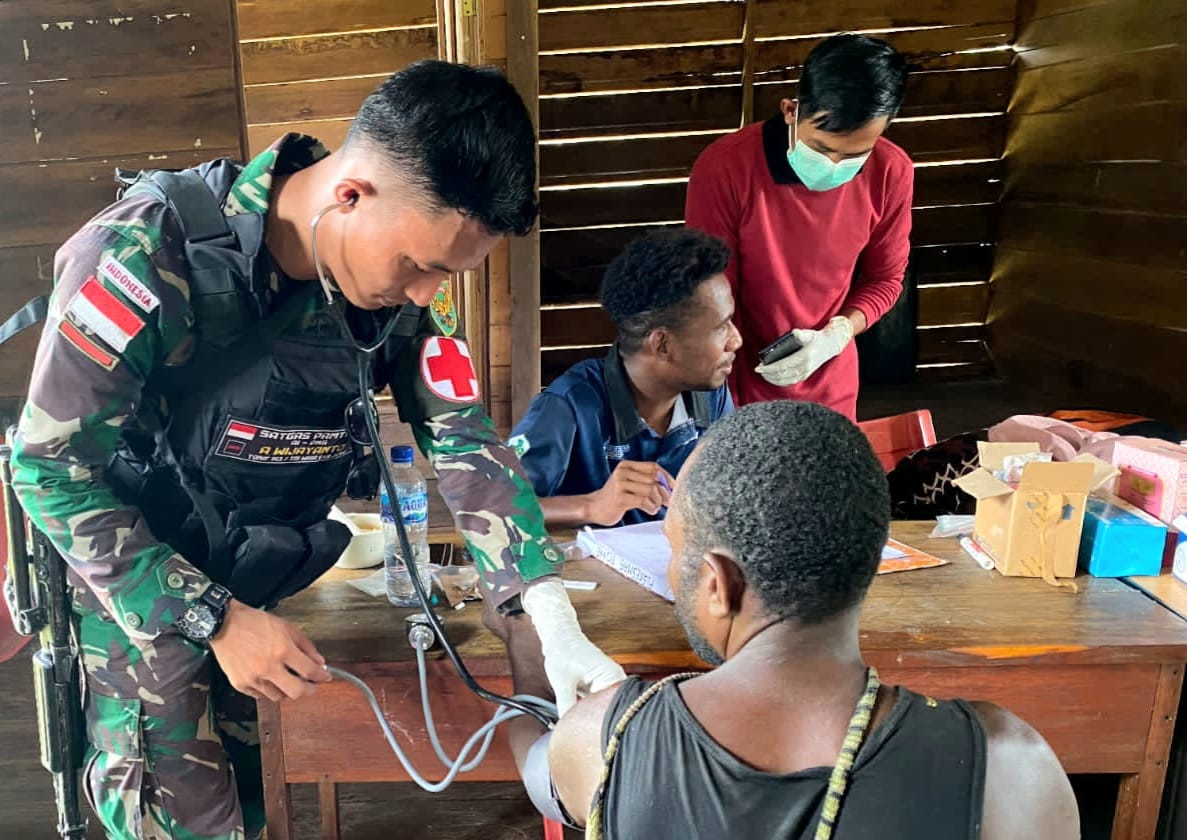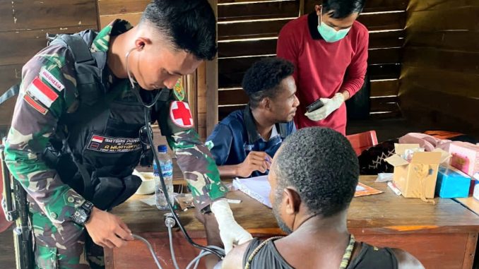 Keerom – Satgas Yonif 143/TWEJ bekerjasama dengan Puskesmas Towe Hitam mengadakan Bakti Sosial pengobatan massal untuk warga masyarakat di Kampung Bias, Distrik Towe Hitam, Kab. Keerom, Papua, Senin ( 19/12/2022).