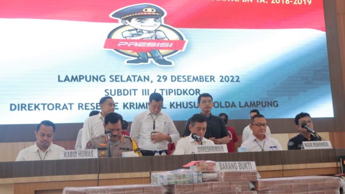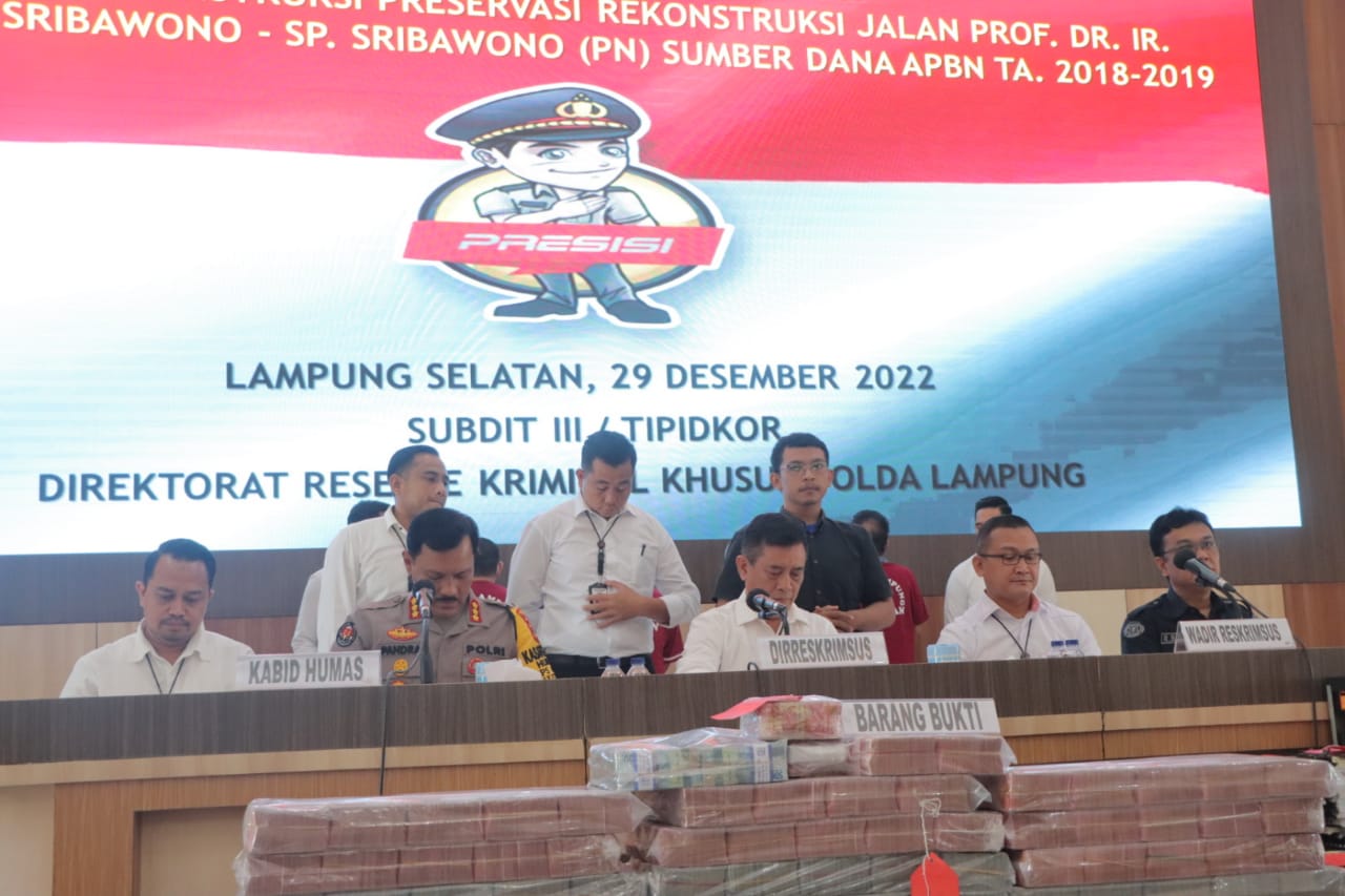 Polda Lampung – Direktorat Kriminal Khusus Polda Lampung Lakukan Konferensi Pers Atas Keberhasil Ungkap Tindak Pidana Korupsi Pekerjaan Kontruksi Preservasi Rekontruksi Jalan Prof Ir Sutami -Sribowono -Sp Sribowono TA 2018-2019. Di GSG Polda Lampung, Lampung Selatan. Kamis (29/12/22).
