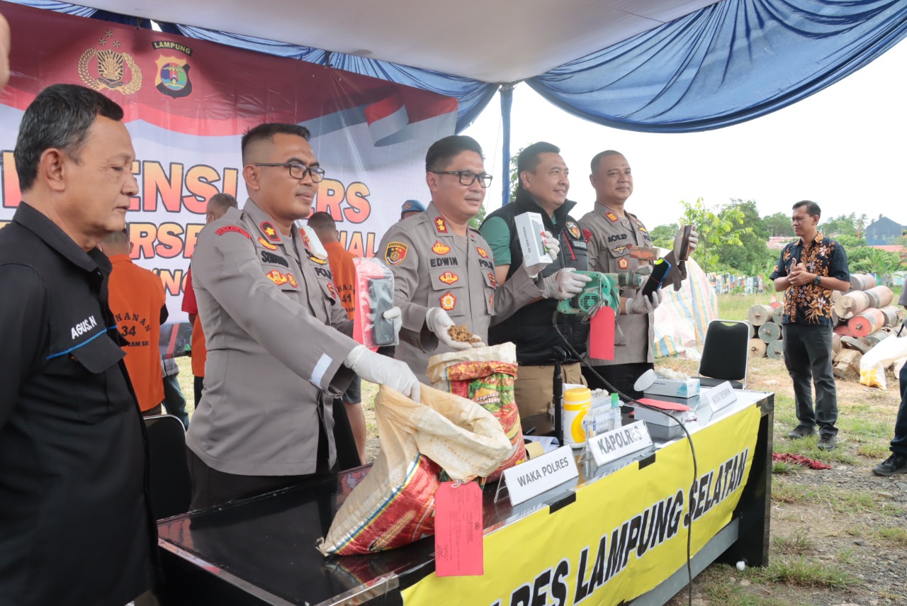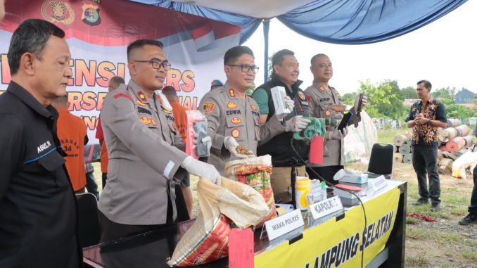 “dari introgasi yang dilakukan terhadap empat orang pekerja tersebut diperoleh informasi bahwa tempat pengolahan hasil tambang berada di dusun teluk harapan” jelas Kapolres AKBP Edwin saat konferensi pers di halaman belakang Polres Lampung Selatan. Jumat, 6/01/2023.