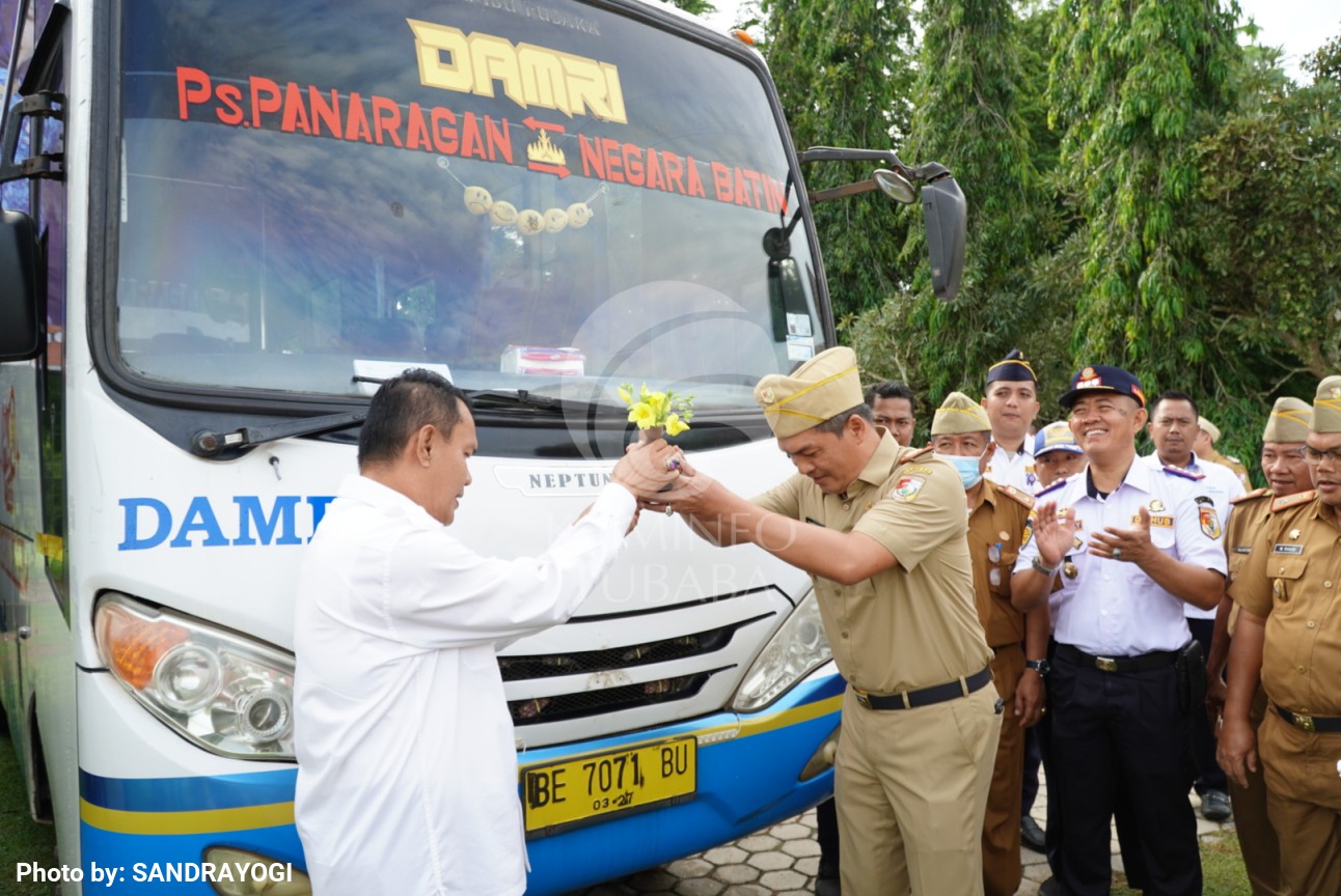 TUBABA – Sekretaris Daerah (Sekda) Kabupaten Tulangbawang Barat (Tubaba) Novriwan Jaya, S.P meresmikan Operasional Trayek Bus Damri Perintis Rute Pasar Panaragan, Pasar Negara Batin Kabupaten Way Kanan, Berlangsung di Lapangan Upacara Pemda Setempat. Senin (09/01/2023).