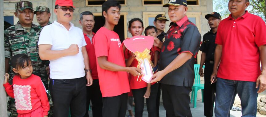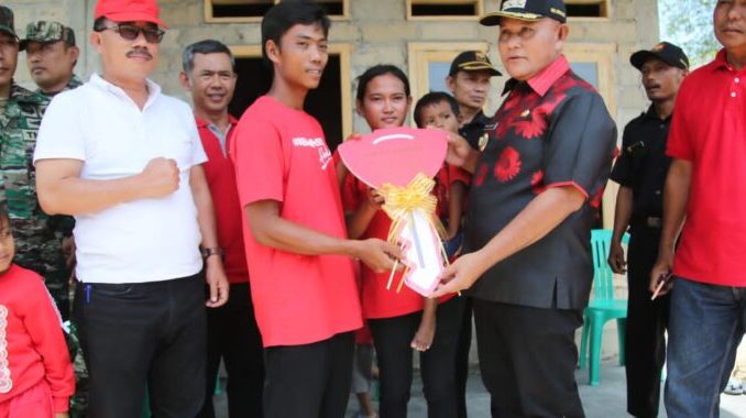 Bupati Lampung Selatan H. Nanang Ermanto menyerahkan secara simbolis kunci rumah kepada Nanang Wiyana (29) yang berprofesi sebagai buruh tambak udang, warga Dusun Bunut Tengah, Desa Bandar Agung, Kecamatan Sragi, Jum’at (13/01/2023).