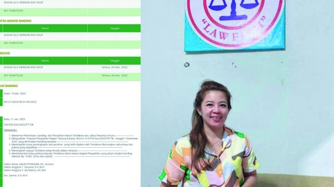 “Ini bukti screenshoot yang kami ambil pada tanggal 12 dan 14 Januari 2023 dari SIPP PN Tanjung Karang atas nama klien kami, Deswita juga mengatakan pada hari Sabtu 14 Januari 2023 sekitar pukul 17.34 WIB, Amar Putusannya berubah, menjadi menguatkan Putusan PN Tanjung Karang No. 615/Pid.Sus/2022/PN Tjk, tanggal 1 Desember 2022.” Ujar Deswita Apriani kepada Media ini Senin (15/1/2023).