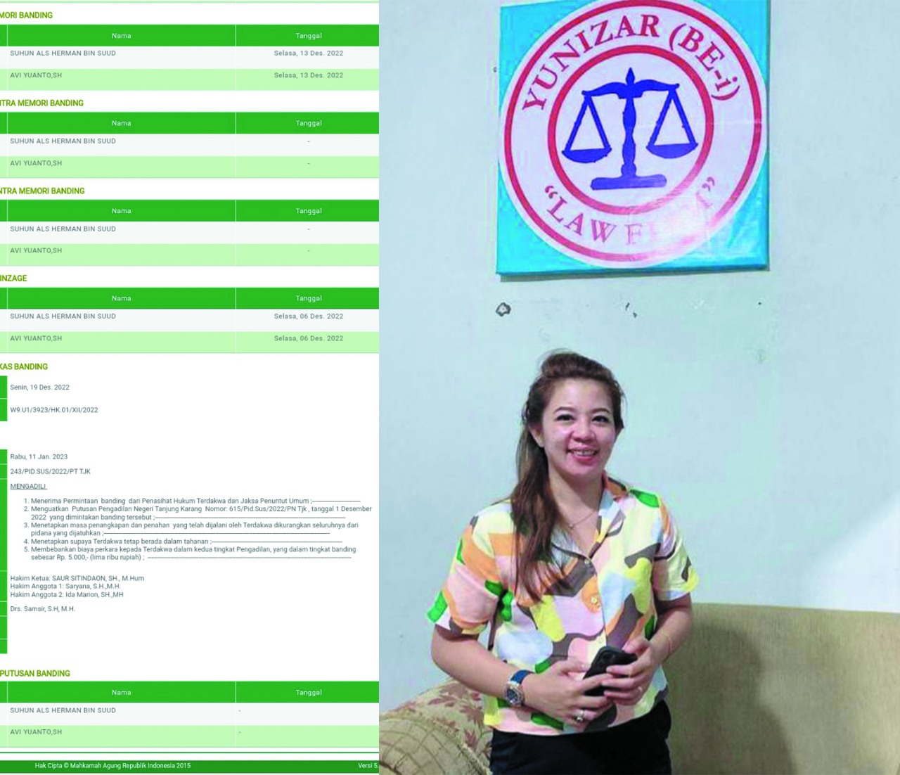 Dikutip dalam isi SIPP Pengadilan Negeri Tanjung Karang tertanggal 11 Januari 2023 sekitar pukul 10.30 WIB, tertulis dengan Amar Bebas tertanggal 11 Januari 2023 dan di upload tgl 12 Januari 2023, pada hari Sabtu tgl 14 Januari 2023, amar putusan berubah menjadi menguatkan putusan PN Tanjung Karang dengan pidana penjara selama 20 tahun. dan menyatakan bahwa terdakwa tidak terbukti secara sah dan meyakinkan melakukan tindak pidana narkotika. Sserta Memerintahkan untuk segera membebaskan terdakwa dari rumah tahanan negara, demikian amar putusan banding.